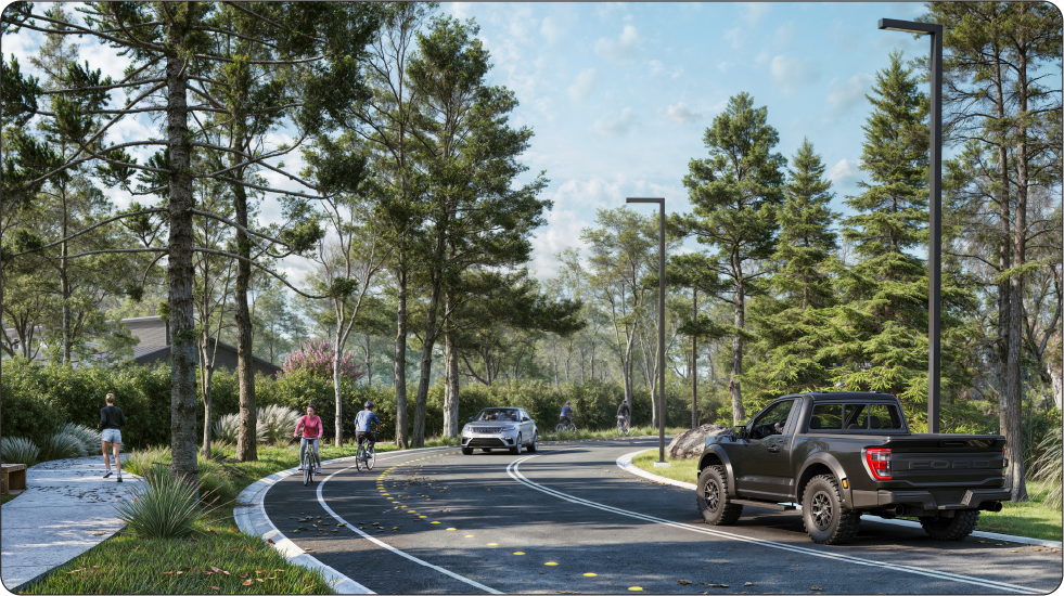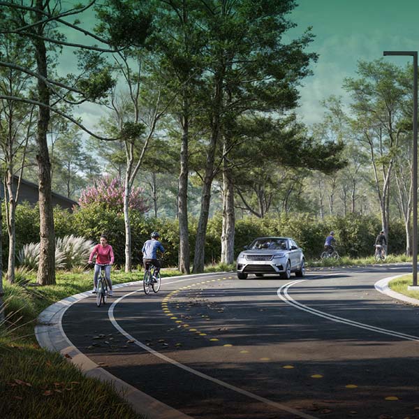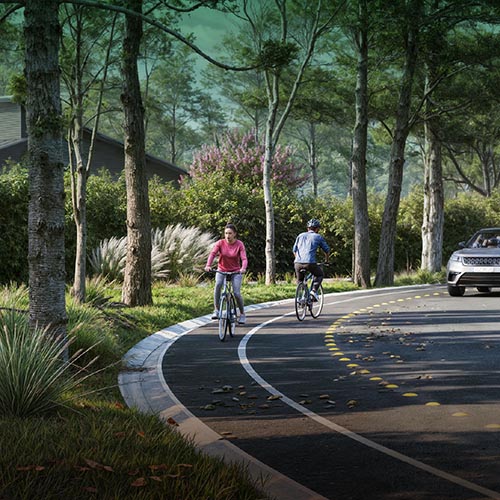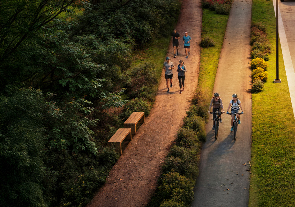 Una red de senderos peatonales, independiente de las calles vehiculares, permite acceder a la reserva de manera segura desde cualquier comunidad. Además, un sendero de 1,5 metros y una bicisenda de 2 metros ofrecen recorridos cómodos y seguros, rodeados de áreas forestadas y conectados al parque natural del barrio.