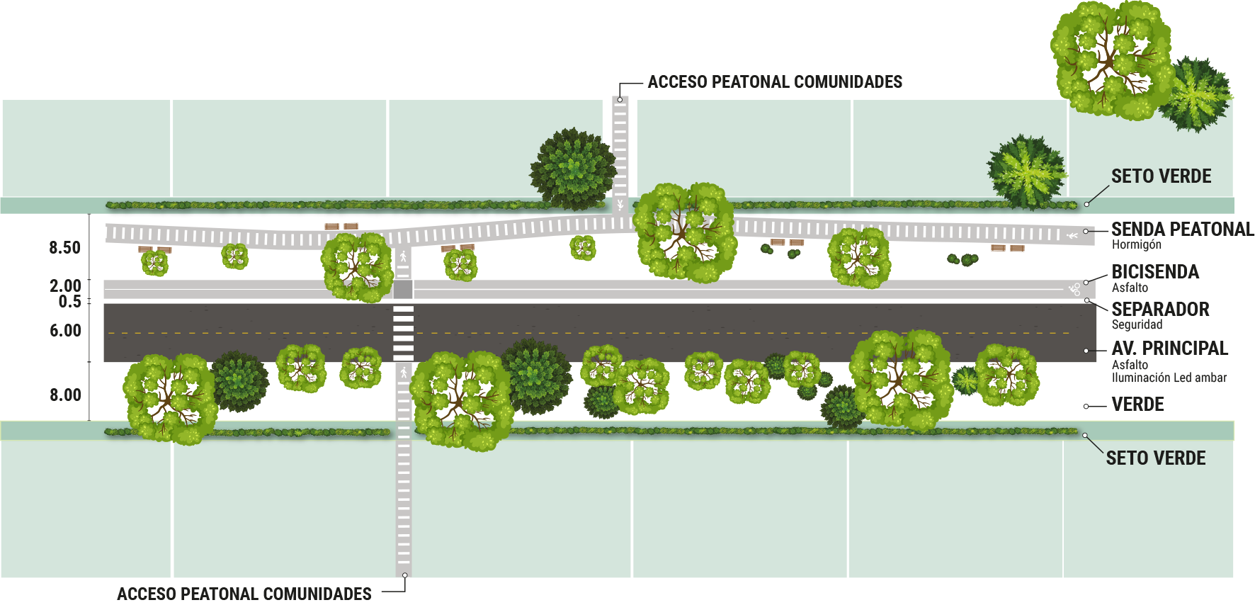 La propuesta paisajística se centra en el diseño de las calles y bulevares, reforzando y respetando el concepto de arbolado existente, pero con un enfoque más claro en la identidad del entorno inmediato.